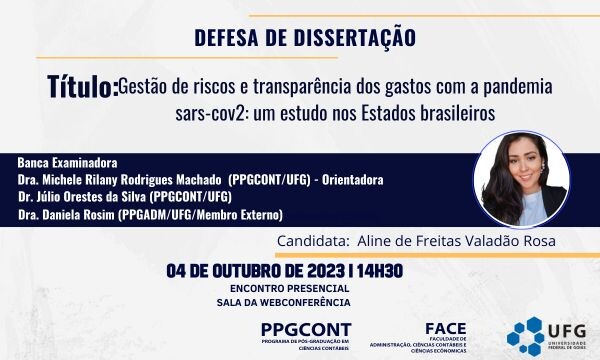O PPGCONT convida a todos para a defesa da dissertação da discente Aline de Freitas Valadão Rosa, sob o título: "Gestão de riscos e transparência dos gastos com a pandemia sars-cov2: um estudo nos Estados brasileiros".